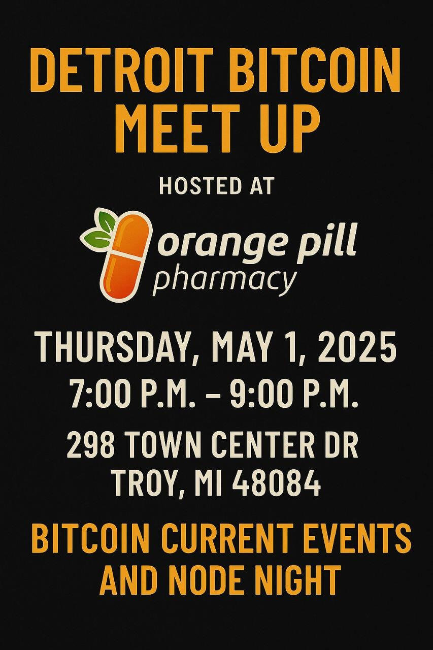 Now hosted at a new location—Orange Pill Pharmacy in Troy, MI, this gathering offers a welcoming, Bitcoin-only space for both newcomers and seasoned Bitcoiners to learn, network, and grow within the community.