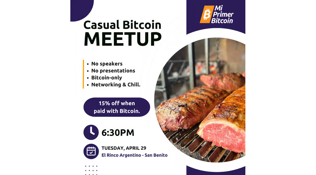 Come hang out with Mi Primer Bitcoin Meetup for a chill evening of Bitcoin conversations, good food, and awesome vibes! Whether you’re a Bitcoin enthusiast or just curious to learn more, everyone’s welcome to join the fun at Rincon Argentino in San Benito, San Salvador.