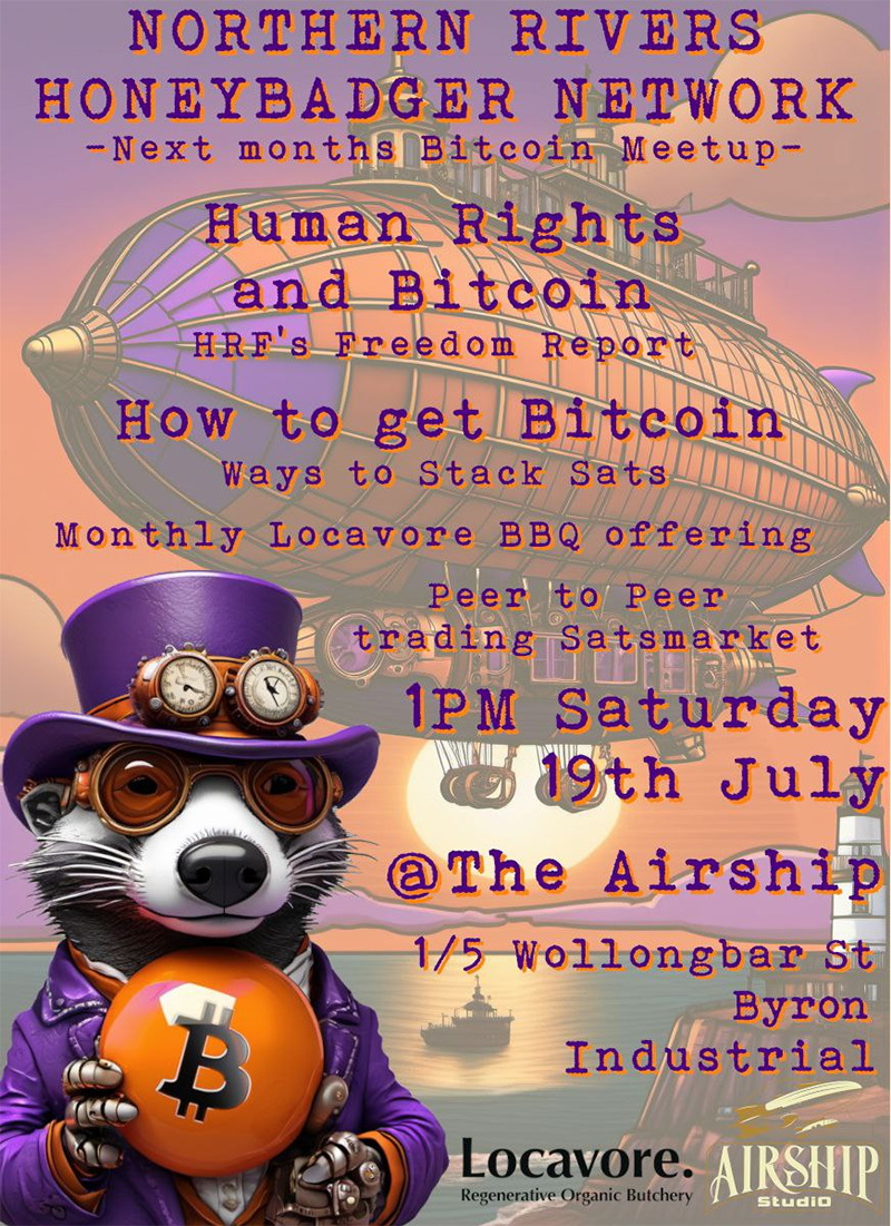 Join us on July 12th from 1:00 PM at The Airship (1/5 Wollongbar St, Byron Bay, NSW) for the Northern Rivers Honeybadger Network Meetup.